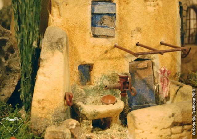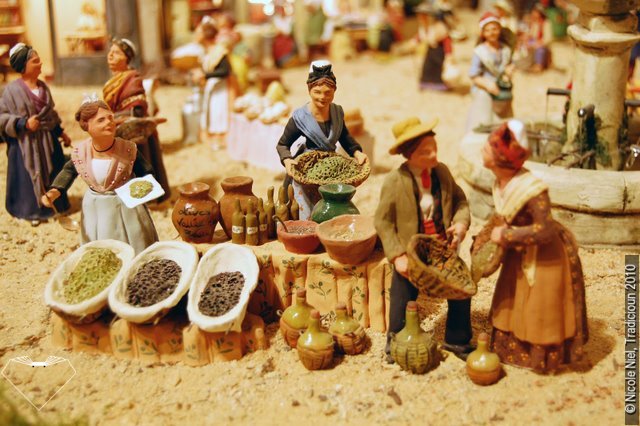 Mais revenons à nos moutons…la crèche des Saintes Maries de la Mer…Arlette BERTELLO n’est pas simplement crèchiste, elle confectionne elle-même beaucoup d’éléments : Des maisons dont elle façonne les tuiles sur le doigt, des accessoires en argile cuite (fruits, légumes, poissons, poteries, articles du Santonnier….), des cagettes et les diverses végétations. Pour échafauder cette immense crèche de presque 4m de profondeur appuyée sur deux murs de la pièce, elle cherche des souqués d’oliviers, des pierres volcaniques, des bois flottés, du liège, de la mousse, des sables et terres de diverses teintes…. toujours à l’affût de tout ce qui peut lui servir. Touche à tout, c’est elle aussi, qui a peint la toile de fond qui met tous ses paysages en valeur.