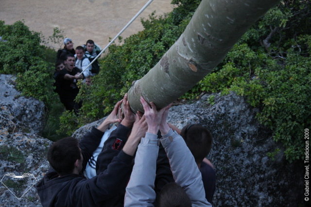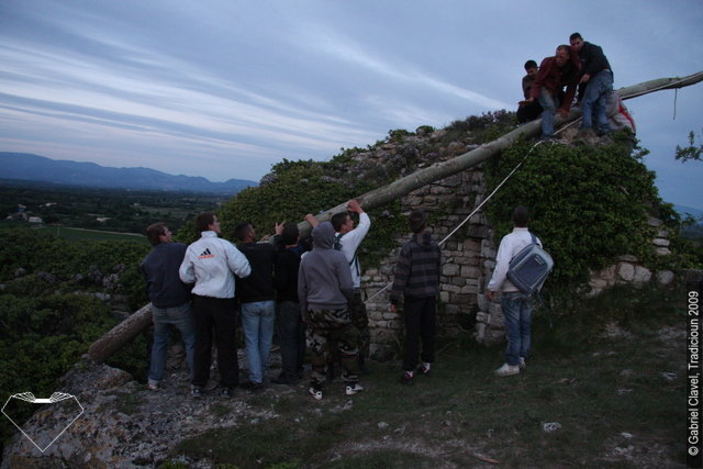 Un « ancien du Mai » arrive sur le lieu de la plantation avec les cordes qui permettront de hisser cet arbre entre deux rochers. Après plusieurs minutes d’effort, l’arbre enfin à la verticale est salué par les quelques badauds restés au village pour contempler l’exploit des garçons du village.