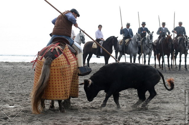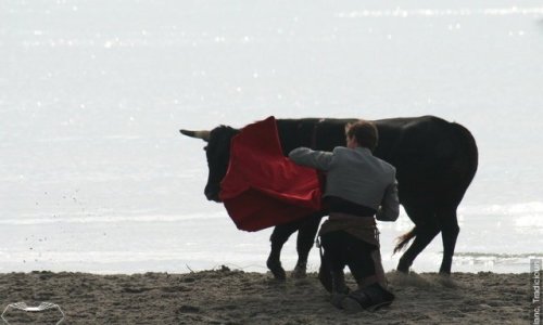 Aux Saintes, il s’agit encore d’une démonstration dans laquelle la Garrocha est manié sans la pression de la compétition. Canaveral ou El Juli s’adonnent à ce plaisir, El Juli tientant ensuite un novillo devant un public déjà acquis à sa cause. Le Sable est leur arène : Mathias Trejela, Davila Miura ou Thomas Joubert les accompagnant pour quelques instants fugaces entre terre et mer.