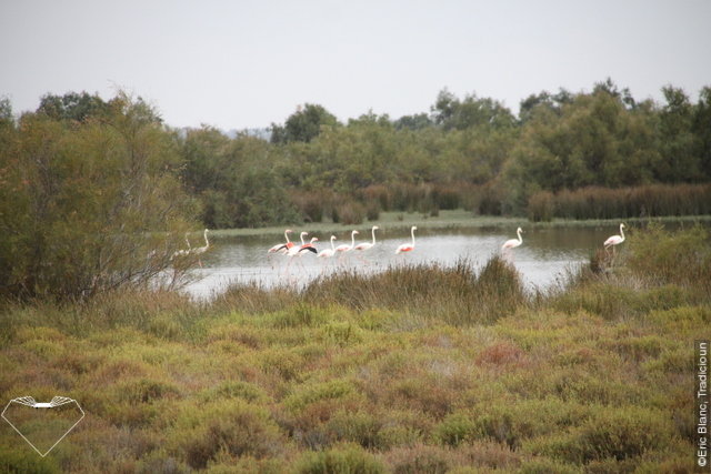 La journée inclut un tour sur les terres, à la rencontre des vaches et des veaux. Nous voilà donc dans la charrette, au milieu des enganes, se dirigeant vers l’ouest et le clocher à peigne si reconnaissable des Saintes Maries qui se découpe sur l’horizon. Au bout d’un chemin qui serpente sur cette terre où le sel ne laisse rien pousser à part la sansouire et la salicorne, un groupe de cavaliers apparait, poussant un troupeau au pas. Passant derrière un étang, la troupe provoque l’envol d’un groupe de flamants roses, seule et unique perturbation de la paix de cette matinée...