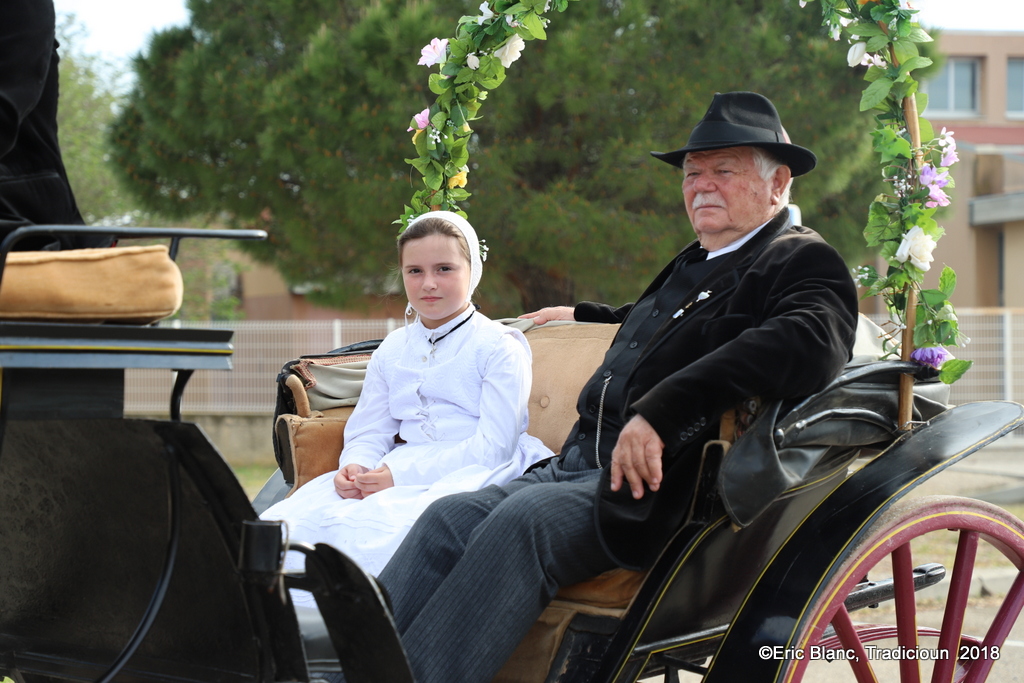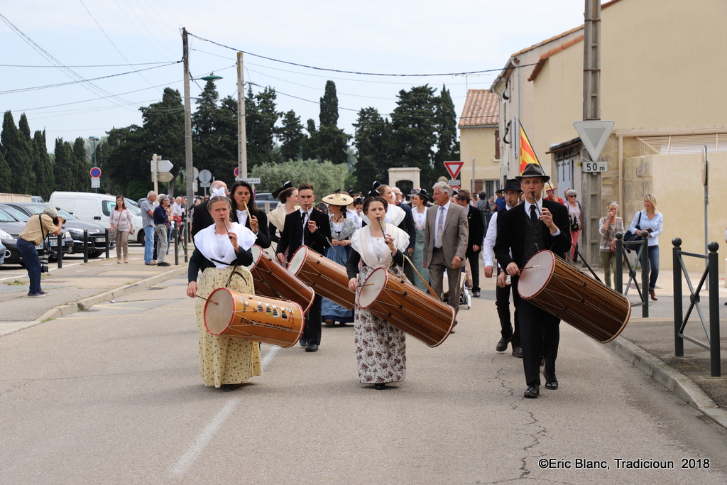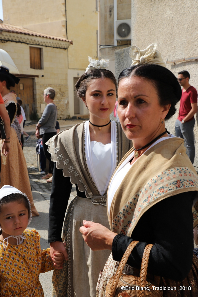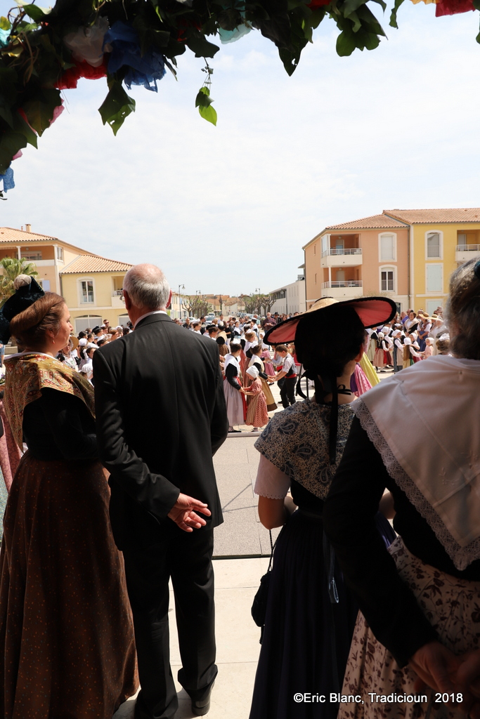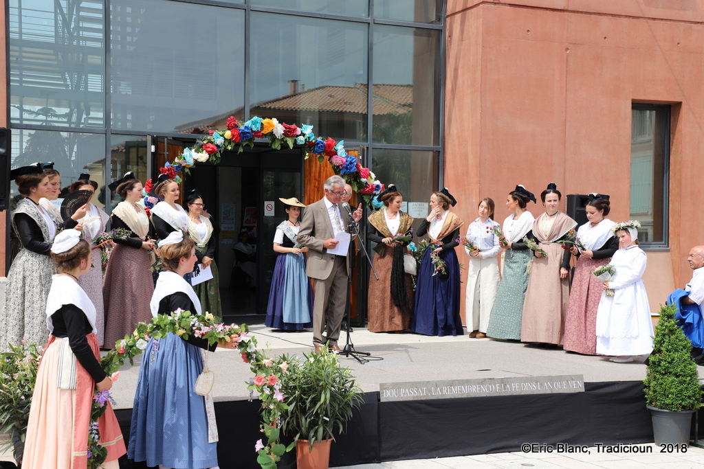 Faustine toute à son nouveau rôle de Maio n’en a pas encore saisi toute la portée, mais pour elle, sont venues toutes nos ambassadrices. La reine d’Arles et sa demoiselle d’honneur, fidèles parmi les fidèles étaient accompagnées par la Dame de St Rémy et sa demoiselle d’honneur, la demoiselle des moulins de Fontvieille et sa demoiselle d’honneur, la damisello dou Castèu de Chateaurenard et sa demoiselle d’honneur, la reine du ruban de Mouriès, l’ambassadrice du Riz, les XVIe et XVIIe reines d’Arles et enfin la Reine du Félibrige choisissant de terminer par Fourques sept années de représentations officielles aux côtés du Capoulié, lui aussi fidèle de la manifestation, venu ce jour avec son sendi du Languedoc et son souto-sendi également secrétaire de la Nacioun Gardiano.