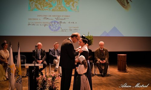 Pèr aquèlis acioun de qualita , ai l’ounour d’espingoula à ta capelo, caro Patricia, la Cigalo d’Argènt de Mestresso d’Obro dóu Felibrige.